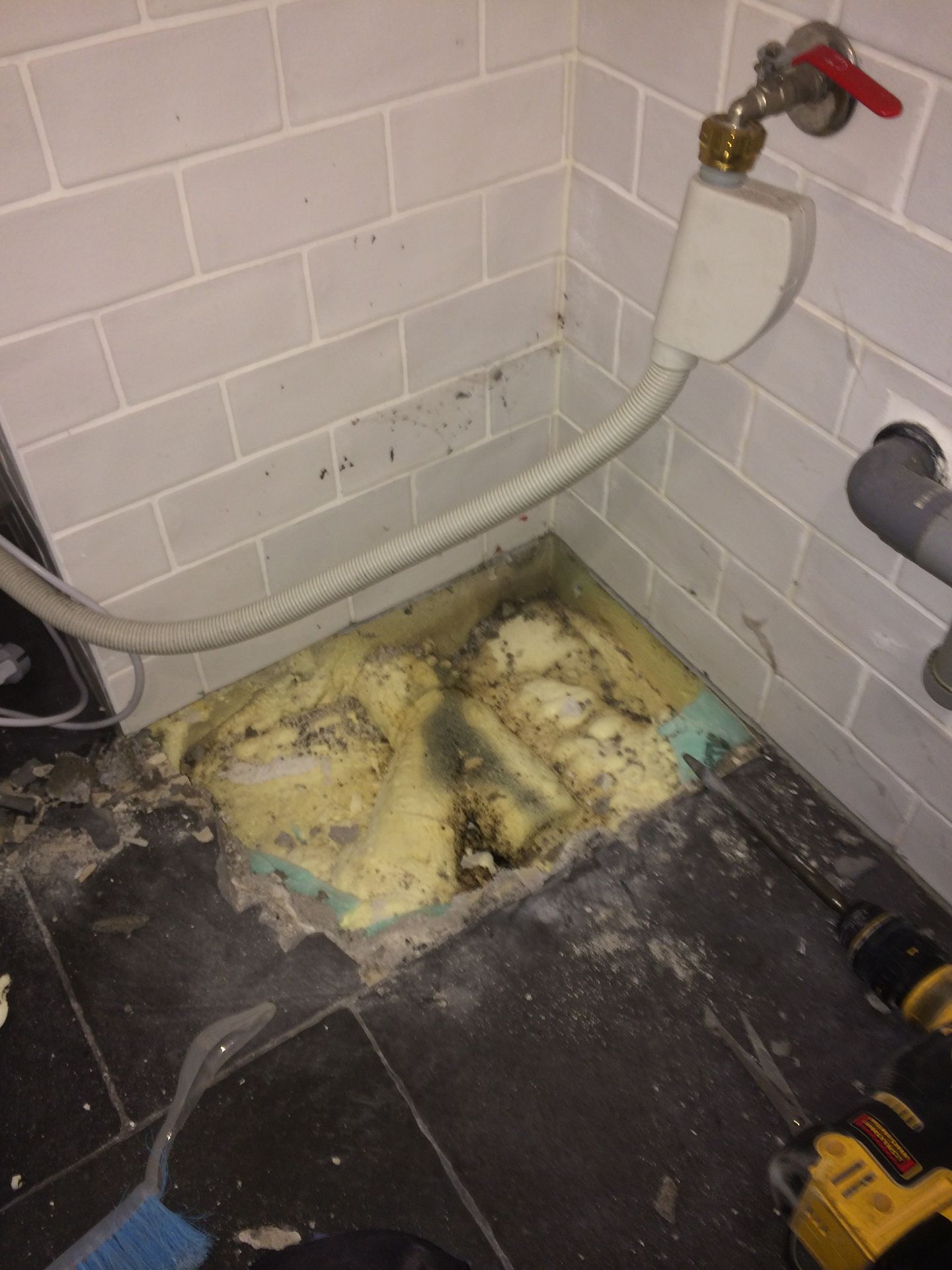 Hierdoor krijgen we toestemming om de vloer plaatselijk open te maken, wetende dat deze locatie enkele meters verwijderd was van lekkage.